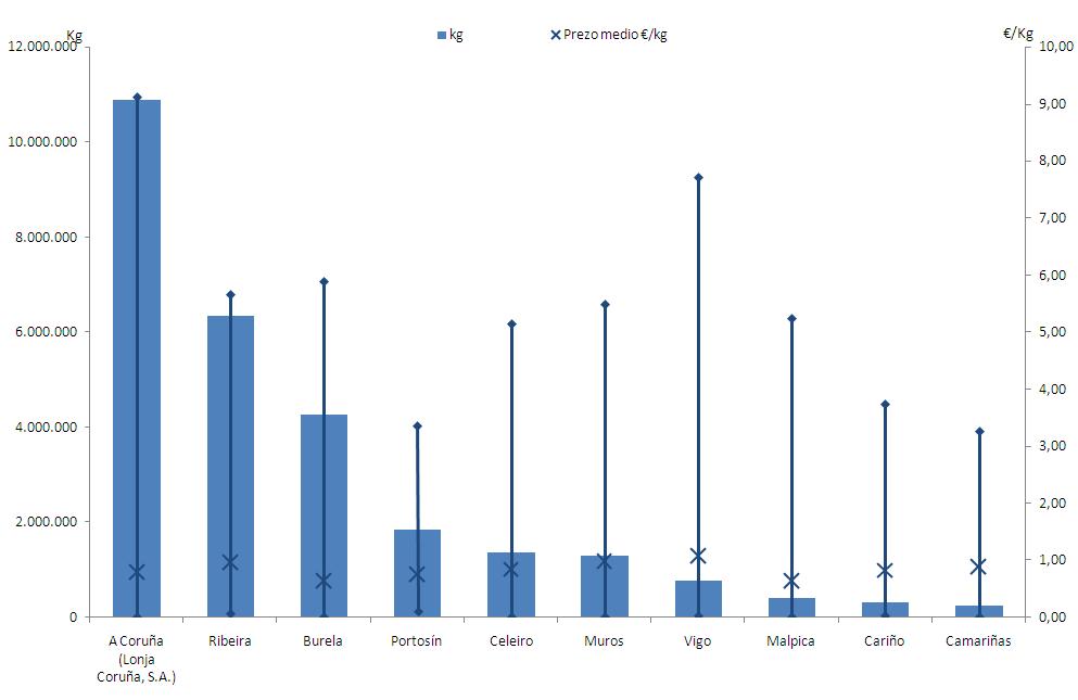 | A Coruña (Lonja Coruña, S.A.) | 294 | 10.877.819 | 38,07% | 8.684.776 | 36,00% | 0,80 |