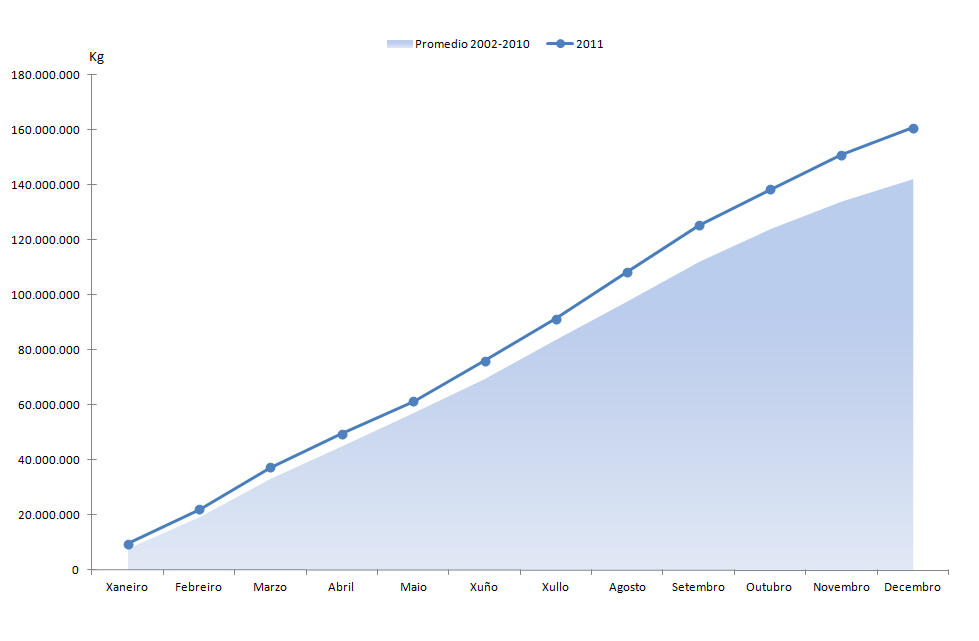 | Xarda pintada | 25.703.713 | 22.931.369 | 18.898.845 | 12.359.500 | 6.804.868 | 10.571.868 | 36,01% | 85,54% |