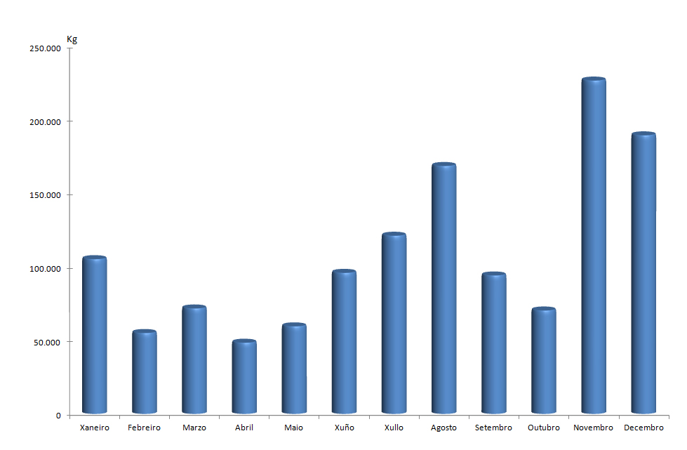 | Percebe | 20.057 | 9.255 | 23.625 | 26.545 | 29.040 | 41.079 | 50.211 | 57.918 | 30.232 | 22.845 | 20.001 | 37.562 | 368.369 |
