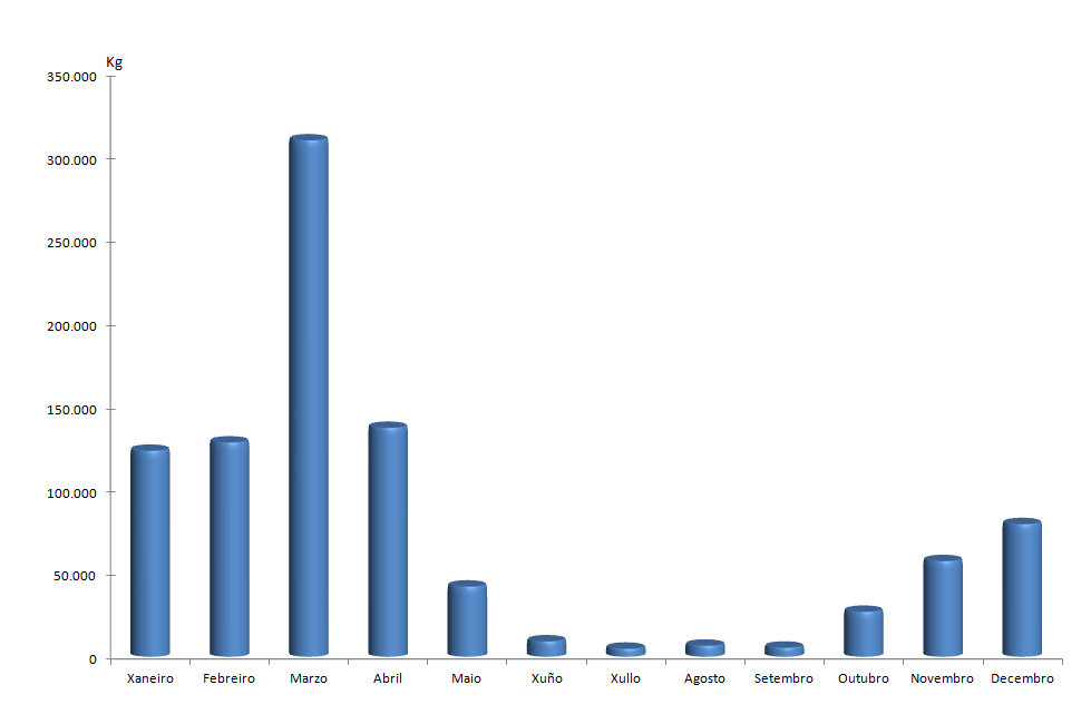 | Ovas de pescada | 11.410 | 21.379 | 13.779 | 18.477 | 10.917 | 5.714 | 2.869 | 3.395 | 3.371 | 1.297 | 2.233 | 10.530 | 105.370 |
