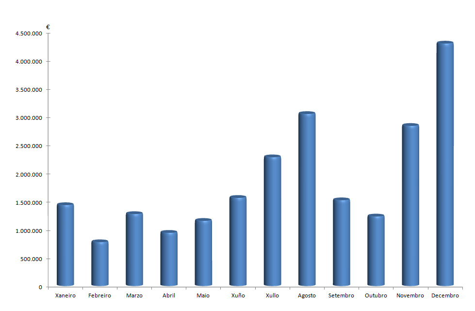 | Xaneiro | Febreiro | Marzo | Abril | Maio | Xuño | Xullo | Agosto | Setembro | Outubro | Novembro | Decembro | Total | |