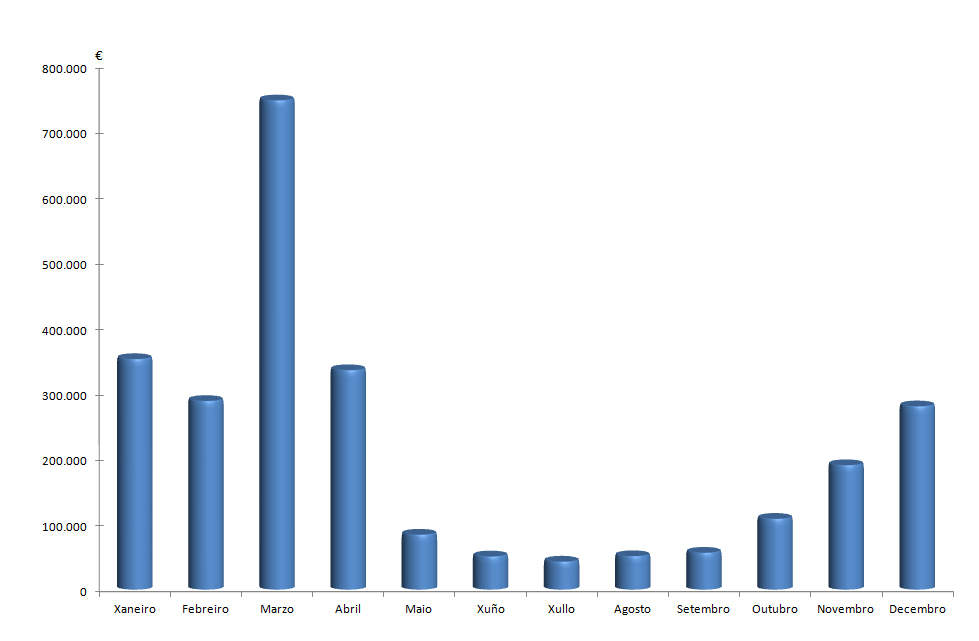 | Xaneiro | Febreiro | Marzo | Abril | Maio | Xuño | Xullo | Agosto | Setembro | Outubro | Novembro | Decembro | Total | |