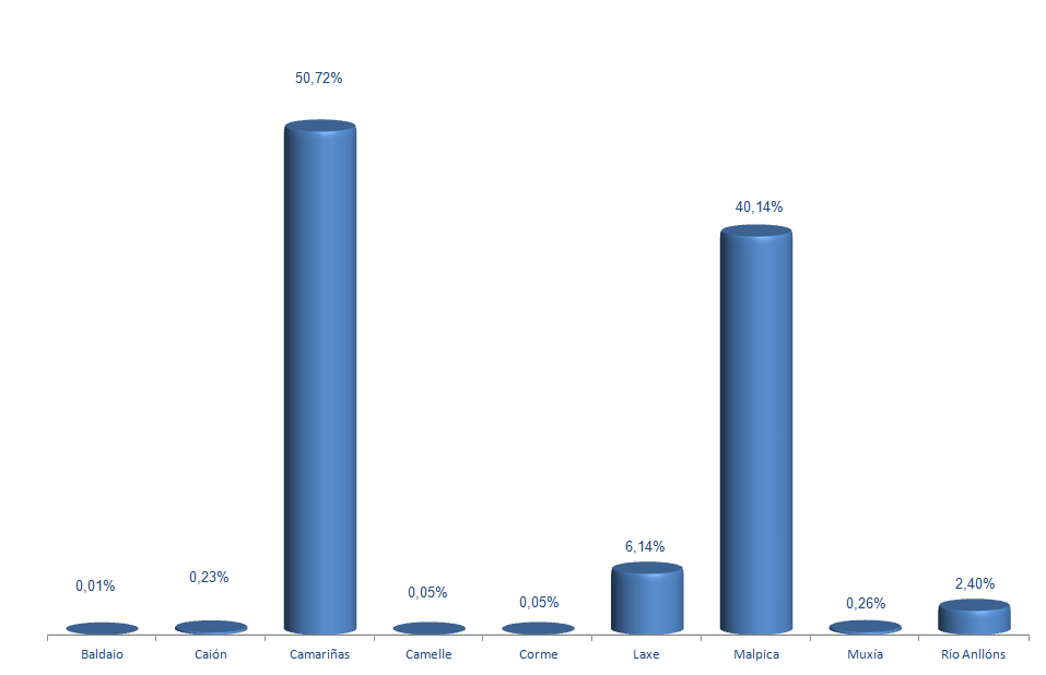 | Muxía | 12.109 | 0,26% | 61.004 | 0,56% | 5,04 |