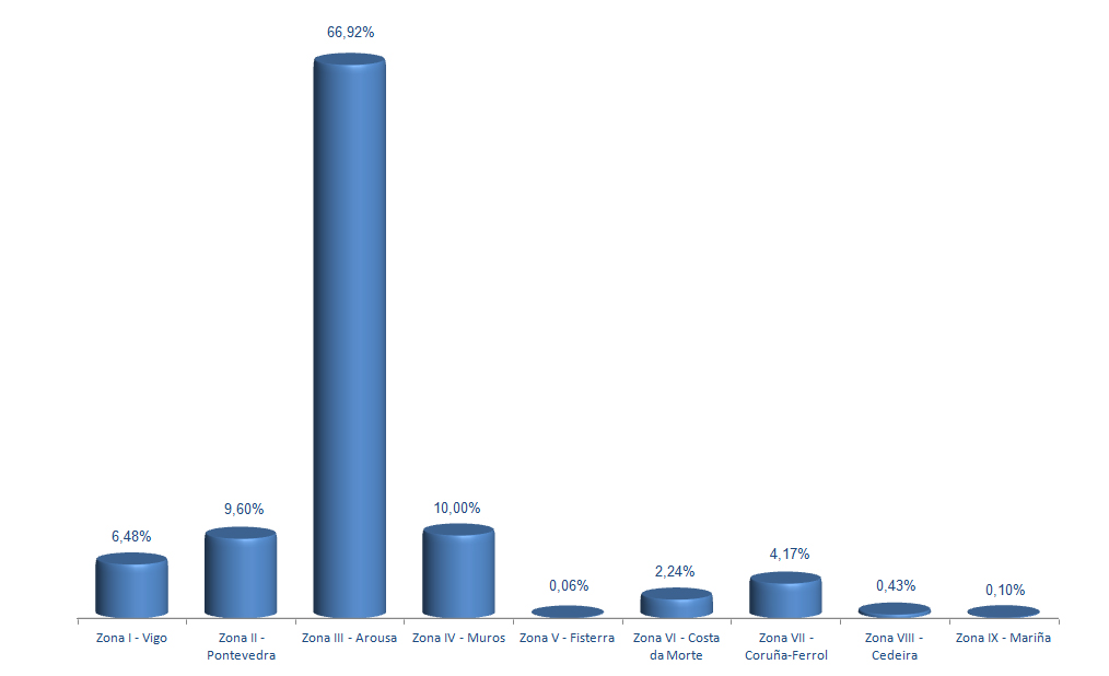 | Zona VI - Costa da Morte | 105 | 17.360 | 2,24% | 304.532 | 2,03% | 17,54 |