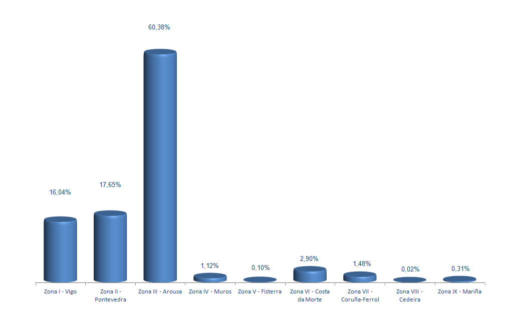 | Zona III - Arousa | 261 | 1.302.980 | 60,38% | 8.128.984 | 62,73% | 6,24 |