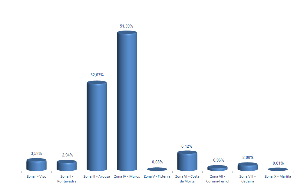 | Zona VIII - Cedeira | 148 | 66.352 | 2,00% | 260.731 | 1,59% | 3,93 |