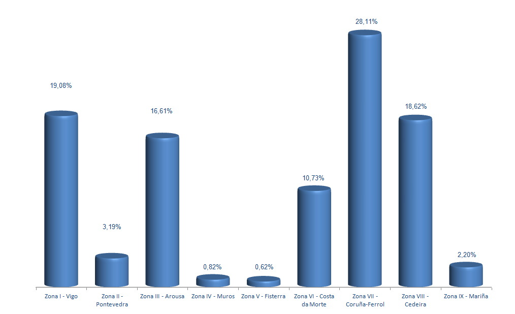 | Zona VII - Coruña-Ferrol | 250 | 103.554 | 28,11% | 1.789.686 | 18,94% | 17,28 |