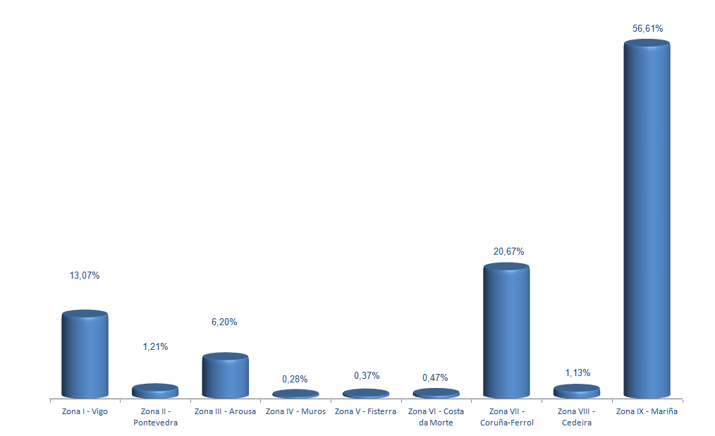 | Zona V - Fisterra | 216 | 69.910 | 0,37% | 204.548 | 0,38% | 2,93 |