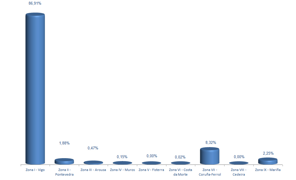 | Zona VI - Costa da Morte | 126 | 1.245 | 0,02% | 7.600 | 0,02% | 6,10 |