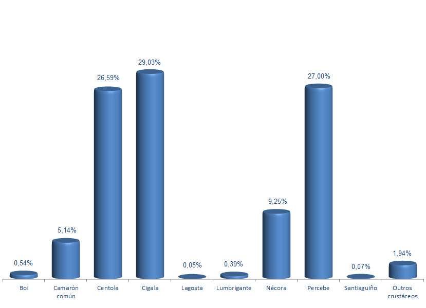 | Outros crustáceos | 24.433 | 1,94% | 33.334 | 0,18% | 1,36 |