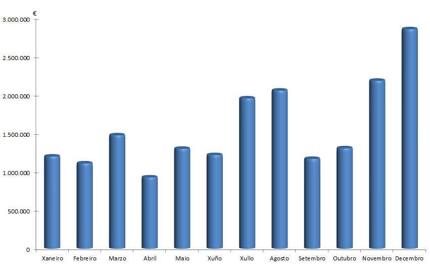 | Xaneiro | Febreiro | Marzo | Abril | Maio | Xuño | Xullo | Agosto | Setembro | Outubro | Novembro | Decembro | Total | |