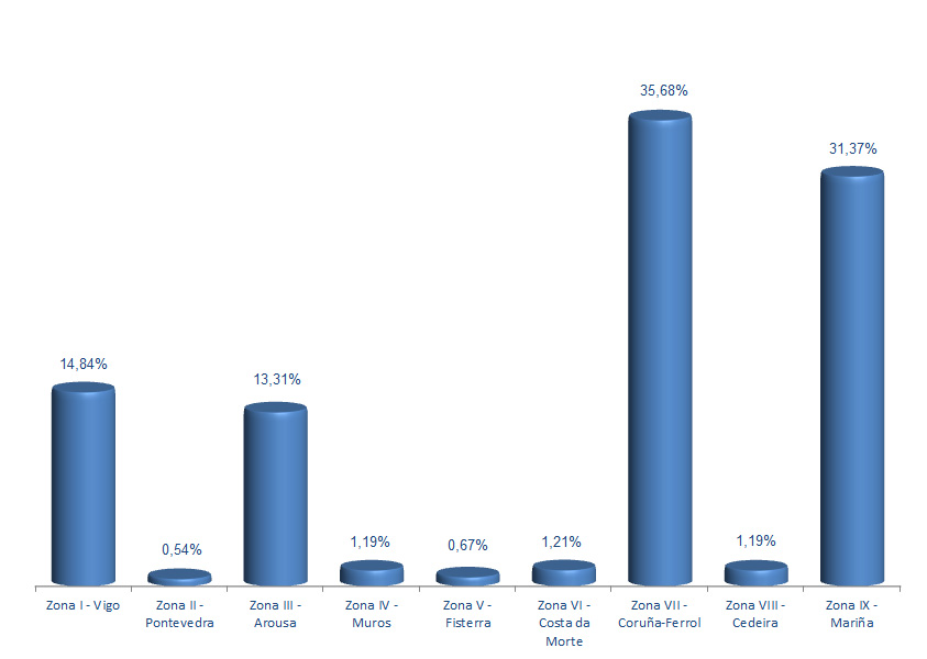 | Zona II - Pontevedra | 265 | 19.585 | 0,54% | 54.113 | 0,77% | 2,76 |