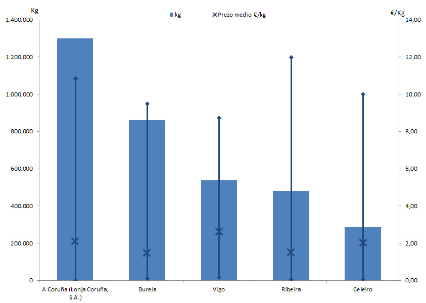 | A Coruña (Lonja Coruña, S.A.) | 286 | 1.301.012 | 35,63% | 2.760.208 | 39,24% | 2,12 |