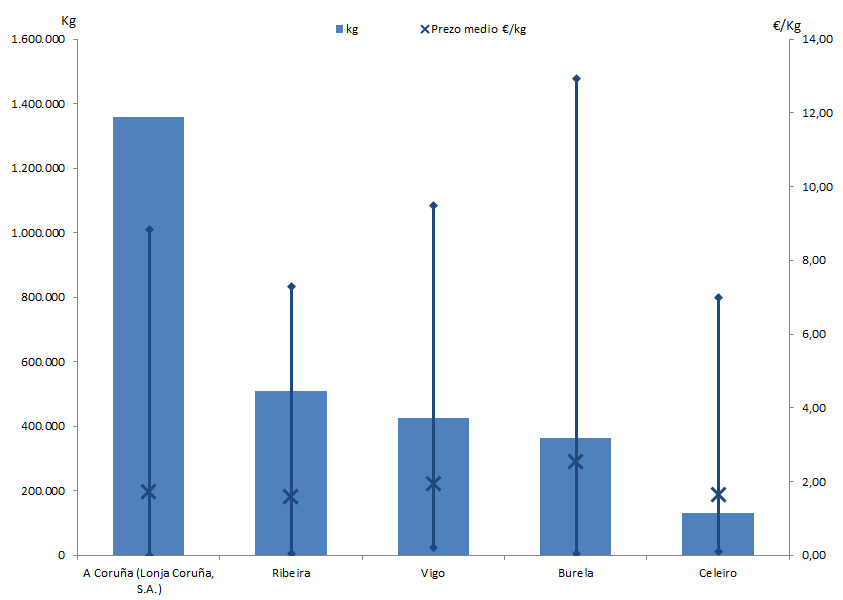 | A Coruña (Lonja Coruña, S.A.) | 258 | 1.359.622 | 42,51% | 2.352.206 | 39,23% | 1,73 |