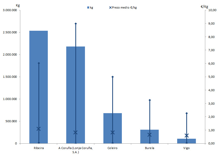 | A Coruña (Lonja Coruña, S.A.) | 246 | 2.181.113 | 36,97% | 1.792.872 | 32,55% | 0,82 |