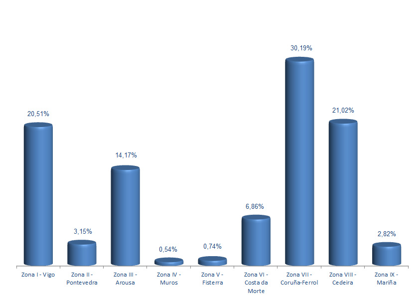 | Zona VI - Costa da Morte | 207 | 23.254 | 6,86% | 368.415 | 5,01% | 15,84 |