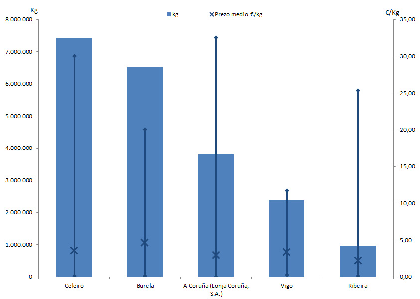 | A Coruña (Lonja Coruña, S.A.) | 303 | 3.802.719 | 17,54% | 11.336.266 | 14,11% | 2,98 |