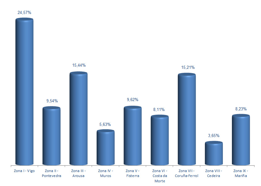| Zona I - Vigo | 286 | 572.690 | 24,57% | 2.943.254 | 22,31% | 5,14 |