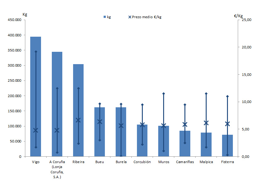 | A Coruña (Lonja Coruña, S.A.) | 205 | 344.844 | 14,79% | 1.657.138 | 12,56% | 4,81 |