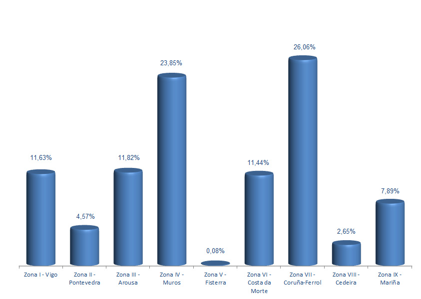 | Zona V - Fisterra | 101 | 6.585 | 0,08% | 5.877 | 0,04% | 0,89 |