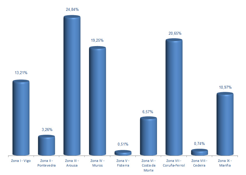 | Zona VI - Costa da Morte | 246 | 1.014.316 | 6,57% | 952.283 | 6,17% | 0,94 |