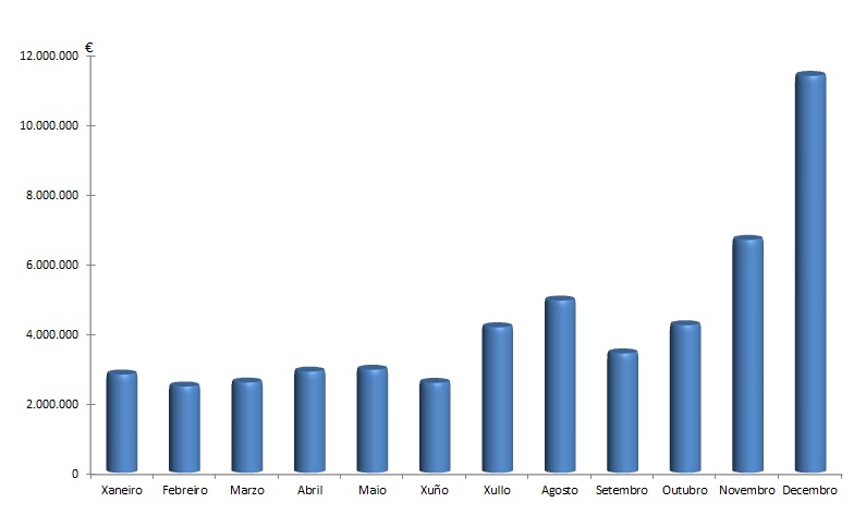 | Xaneiro | Febreiro | Marzo | Abril | Maio | Xuño | Xullo | Agosto | Setembro | Outubro | Novembro | Decembro | Total | |