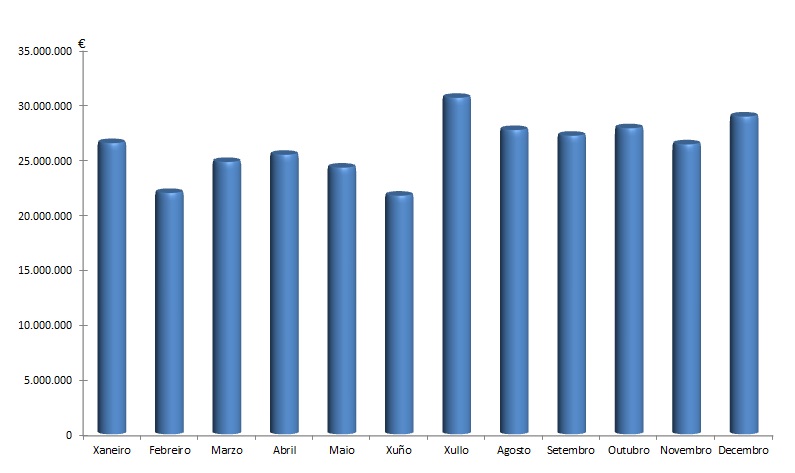 | Xaneiro | Febreiro | Marzo | Abril | Maio | Xuño | Xullo | Agosto | Setembro | Outubro | Novembro | Decembro | Total | |