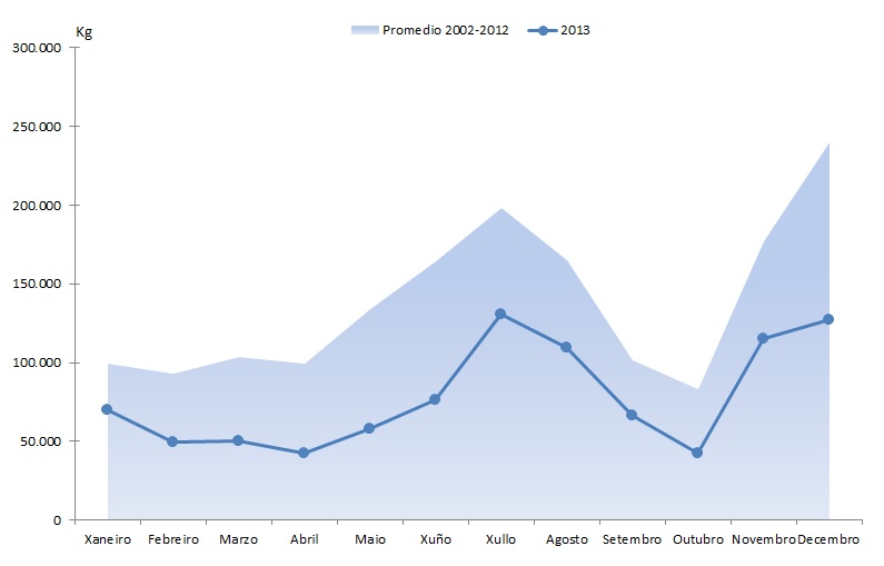 | Xuño | 76.250 | 1.308.661 | 81.480 | 1.217.850 | -5.230 | 90.811 | -6,42% | 7,46% |