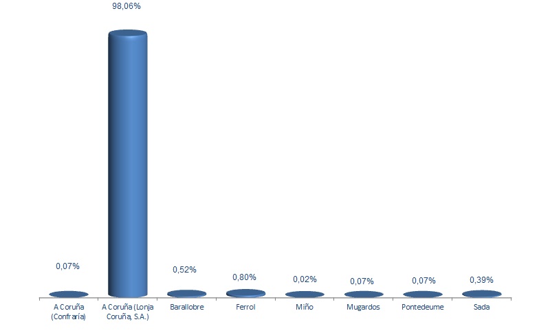 | A Coruña (Lonja Coruña, S.A.) | 39.935.035 | 98,06% | 82.977.197 | 94,96% | 2,08 |