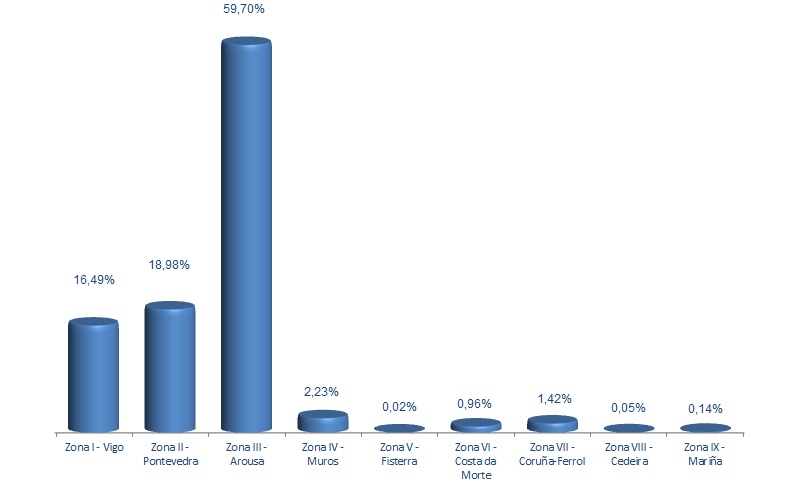 | Zona III - Arousa | 258 | 1.156.716 | 59,70% | 6.568.818 | 63,09% | 5,68 |