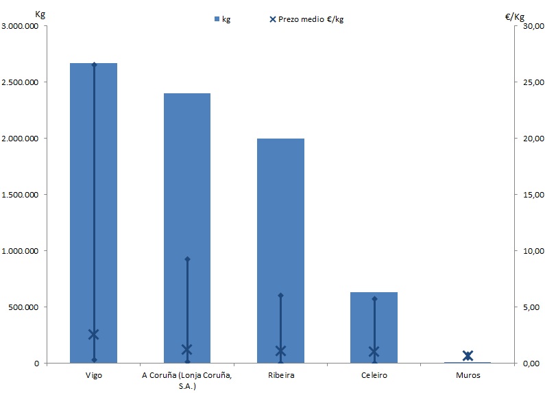 | A Coruña (Lonja Coruña, S.A.) | 246 | 2.401.100 | 31,18% | 2.852.687 | 22,71% | 1,19 |