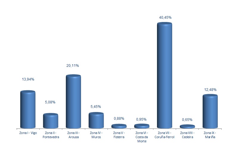 | Zona VI - Costa da Morte | 248 | 23.370 | 0,95% | 61.263 | 1,44% | 2,62 |