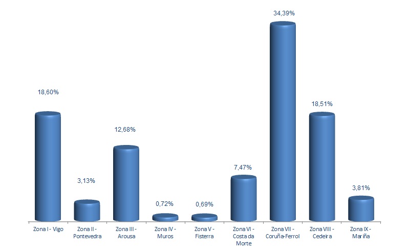 | Zona VI - Costa da Morte | 205 | 24.247 | 7,47% | 362.816 | 5,21% | 14,96 |
