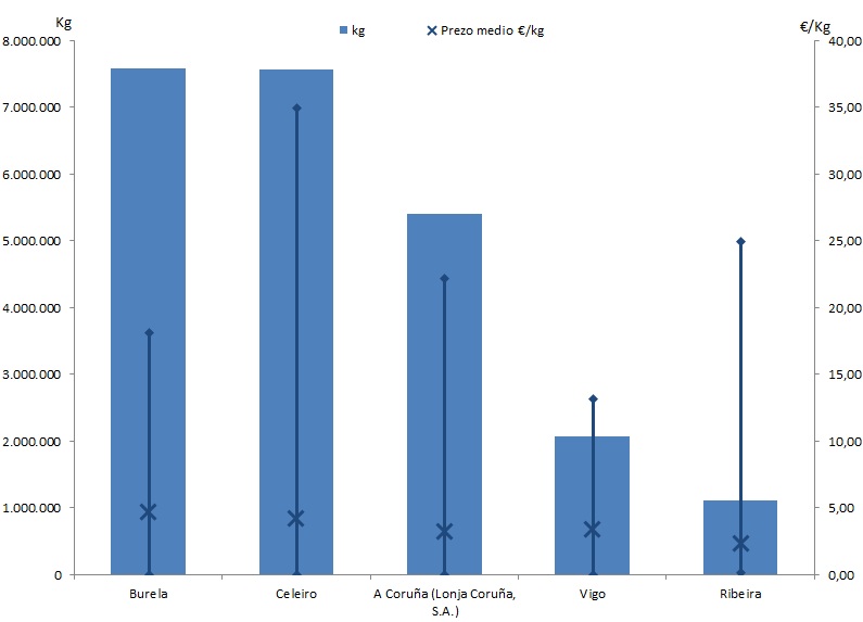 | A Coruña (Lonja Coruña, S.A.) | 304 | 5.401.622 | 22,19% | 17.679.945 | 18,21% | 3,27 |