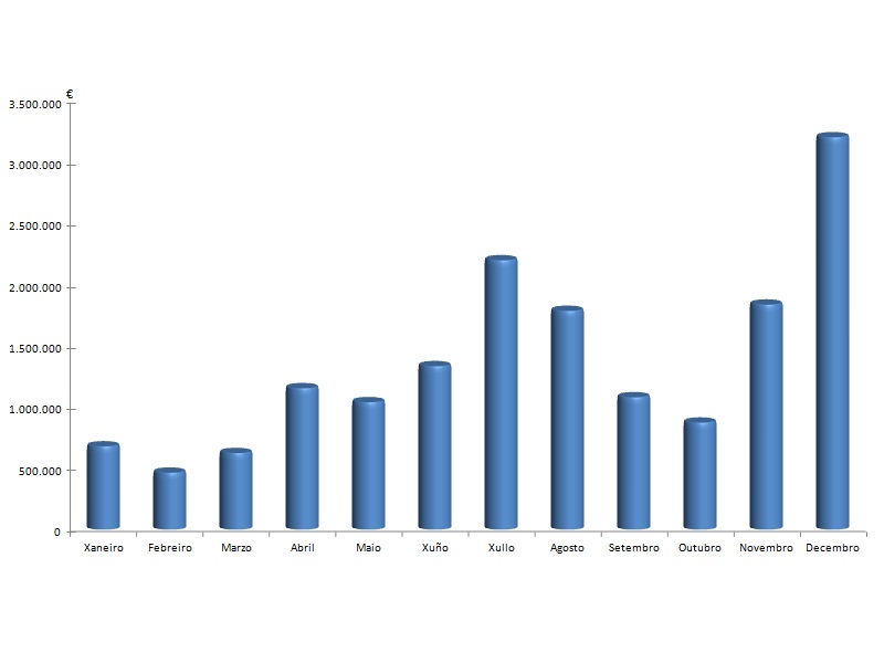 | Xaneiro | Febreiro | Marzo | Abril | Maio | Xuño | Xullo | Agosto | Setembro | Outubro | Novembro | Decembro | Total | |