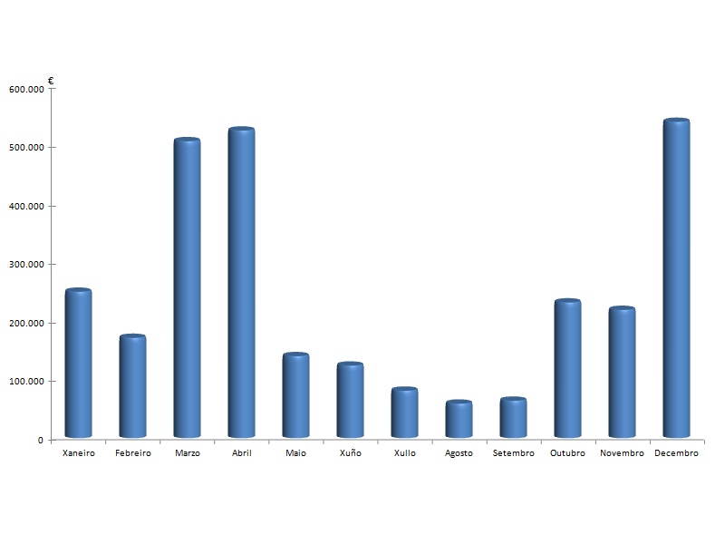 | Xaneiro | Febreiro | Marzo | Abril | Maio | Xuño | Xullo | Agosto | Setembro | Outubro | Novembro | Decembro | Total | |