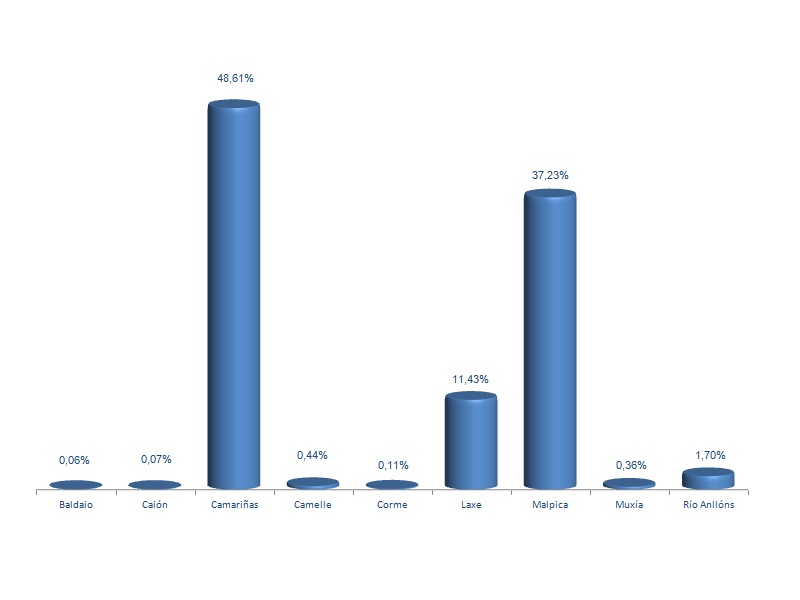 | Muxía | 20.851 | 0,36% | 78.504 | 1,02% | 3,76 |