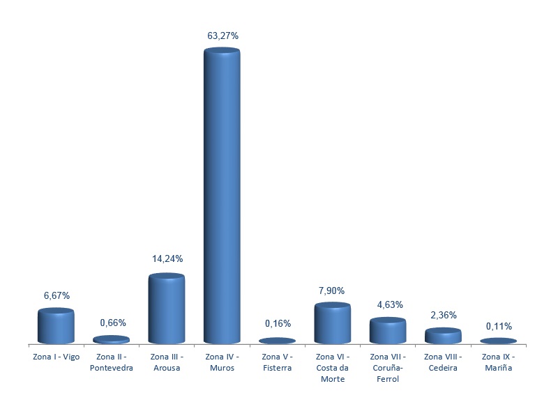 | Zona VI - Costa da Morte | 144 | 100.174 | 7,90% | 569.803 | 7,24% | 5,69 |