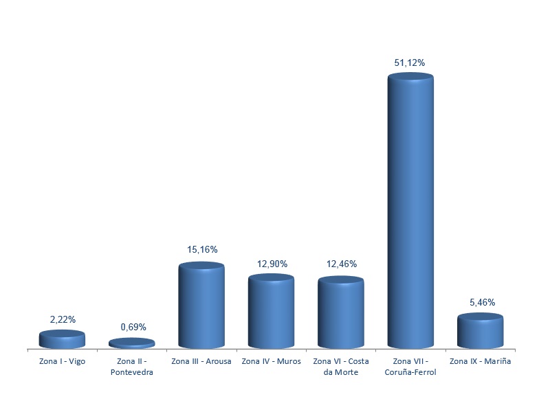 | Zona II - Pontevedra | 101 | 16.065 | 0,69% | 46.775 | 1,27% | 2,91 |