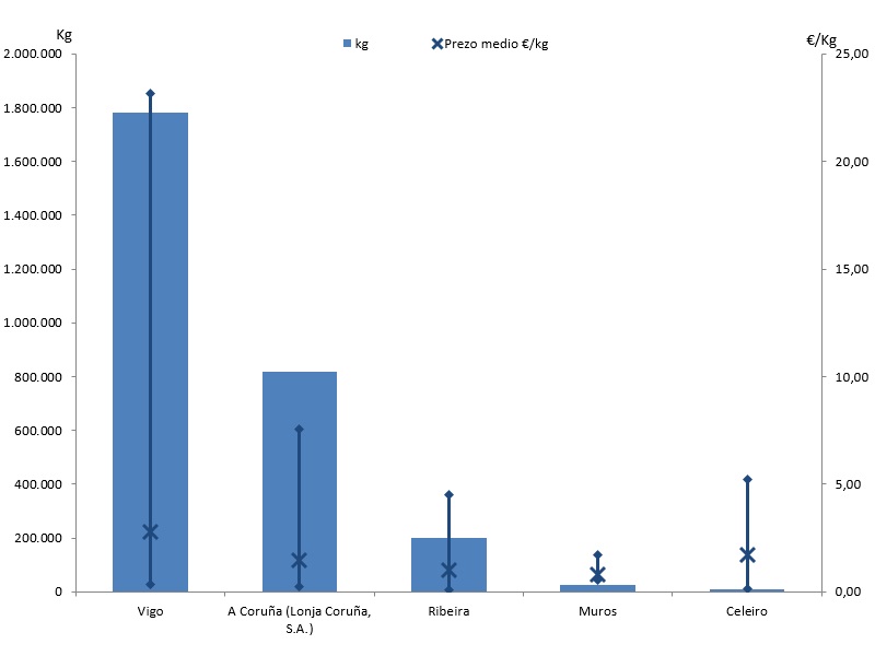 | A Coruña (Lonja Coruña, S.A.) | 210 | 816.757 | 28,79% | 1.208.024 | 18,70% | 1,48 |