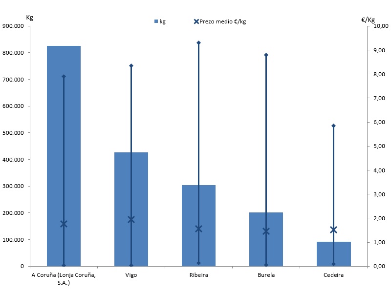| A Coruña (Lonja Coruña, S.A.) | 272 | 825.083 | 40,78% | 1.449.868 | 42,22% | 1,76 |
