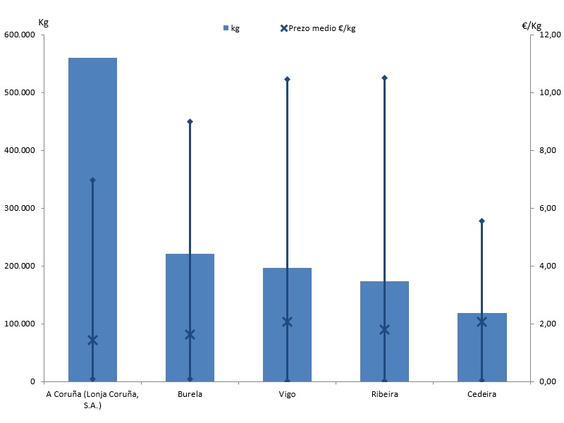 | A Coruña (Lonja Coruña, S.A.) | 251 | 560.326 | 35,17% | 805.937 | 28,14% | 1,44 |