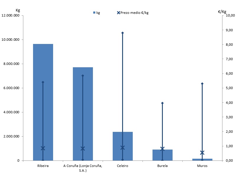 | A Coruña (Lonja Coruña, S.A.) | 258 | 7.713.229 | 36,71% | 6.337.927 | 35,84% | 0,82 |