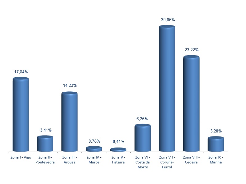 | Zona VI - Costa da Morte | 208 | 20.262 | 6,26% | 308.931 | 4,06% | 15,25 |