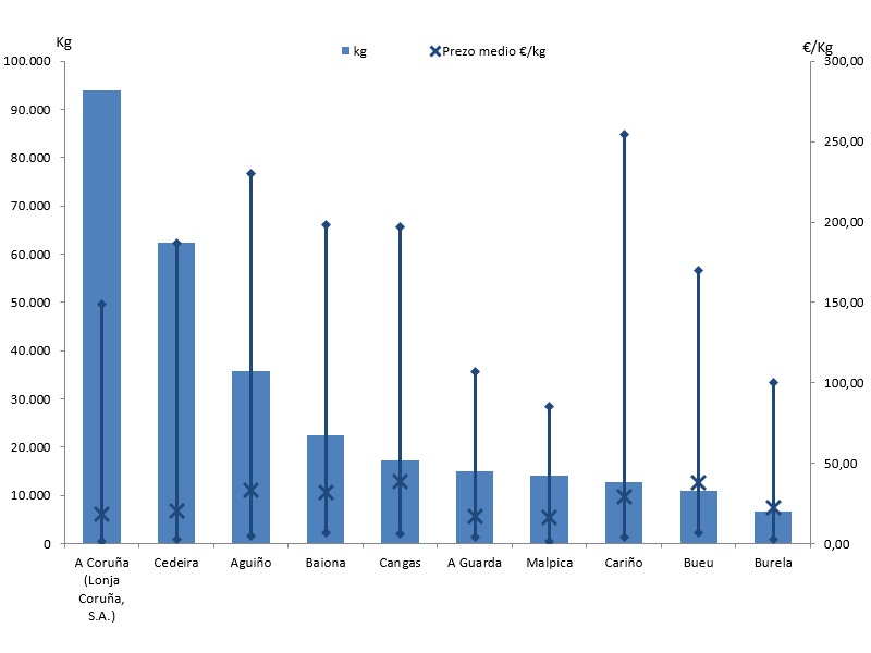 | A Coruña (Lonja Coruña, S.A.) | 238 | 94.008 | 29,04% | 1.743.992 | 22,90% | 18,55 |
