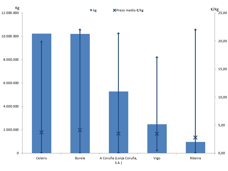 | A Coruña (Lonja Coruña, S.A.) | 303 | 5.283.854 | 17,59% | 18.398.071 | 16,36% | 3,48 |