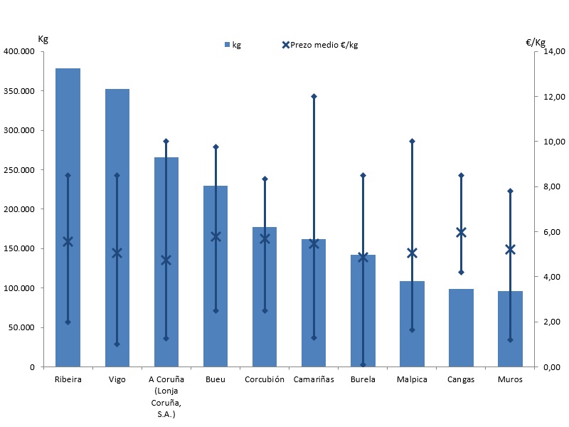| A Coruña (Lonja Coruña, S.A.) | 214 | 266.088 | 10,04% | 1.259.119 | 8,99% | 4,73 |
