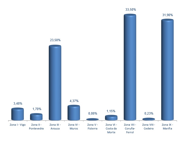 | Zona VI - Costa da Morte | 114 | 147.629 | 1,15% | 90.683 | 0,88% | 0,61 |