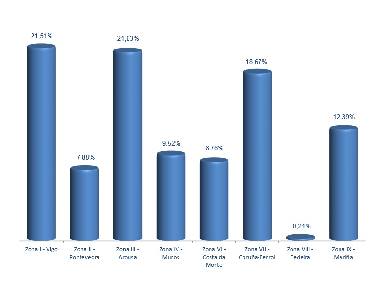 | Zona VI - Costa da Morte | 136 | 1.871.332 | 8,78% | 739.300 | 7,85% | 0,40 |