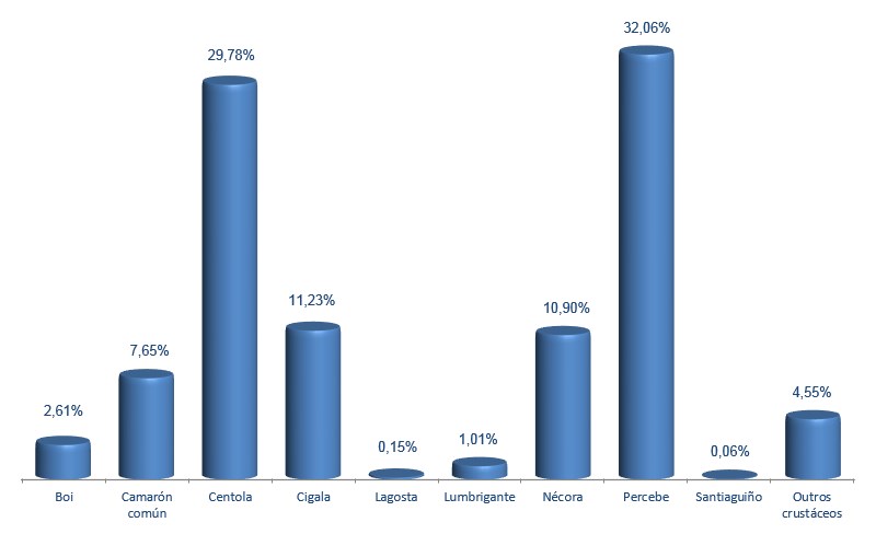 | Outros crustáceos | 44.653 | 4,55% | 126.509 | 0,77% | 2,83 |
